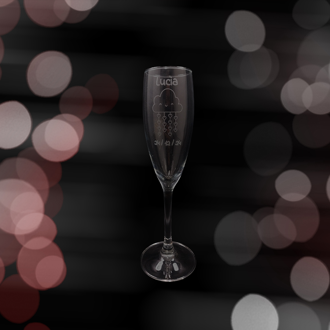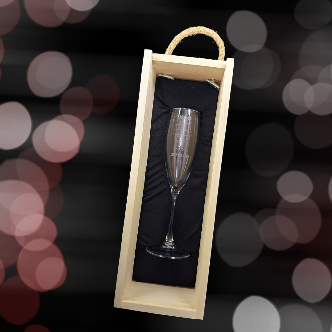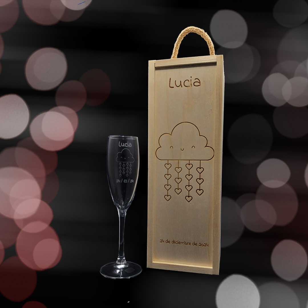 Kit de 1 copa de cava grabada con estuche de madera personalizado Modelo Bautizo.