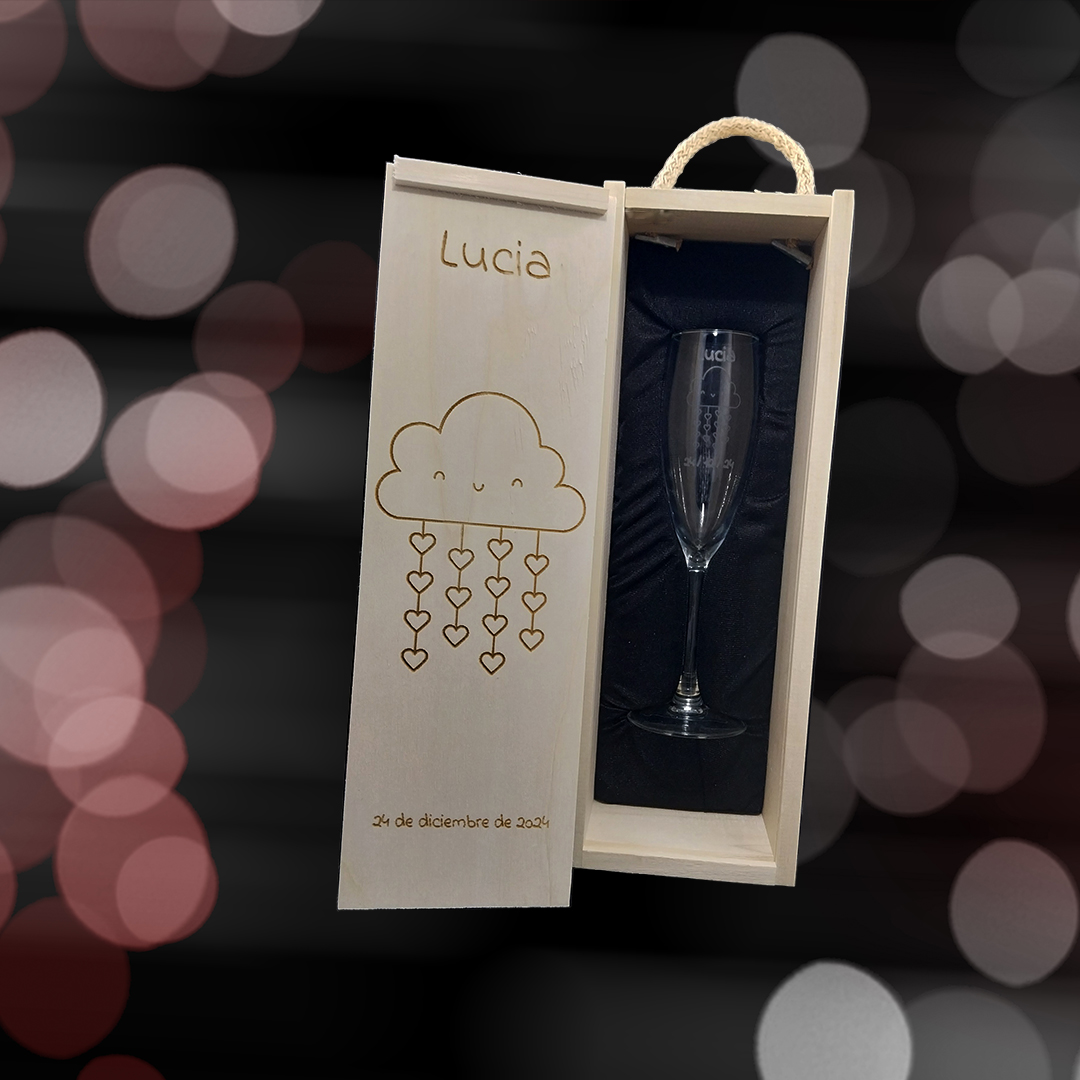 Kit de 1 copa de cava con estuche de madera personalizado modelo bautizo