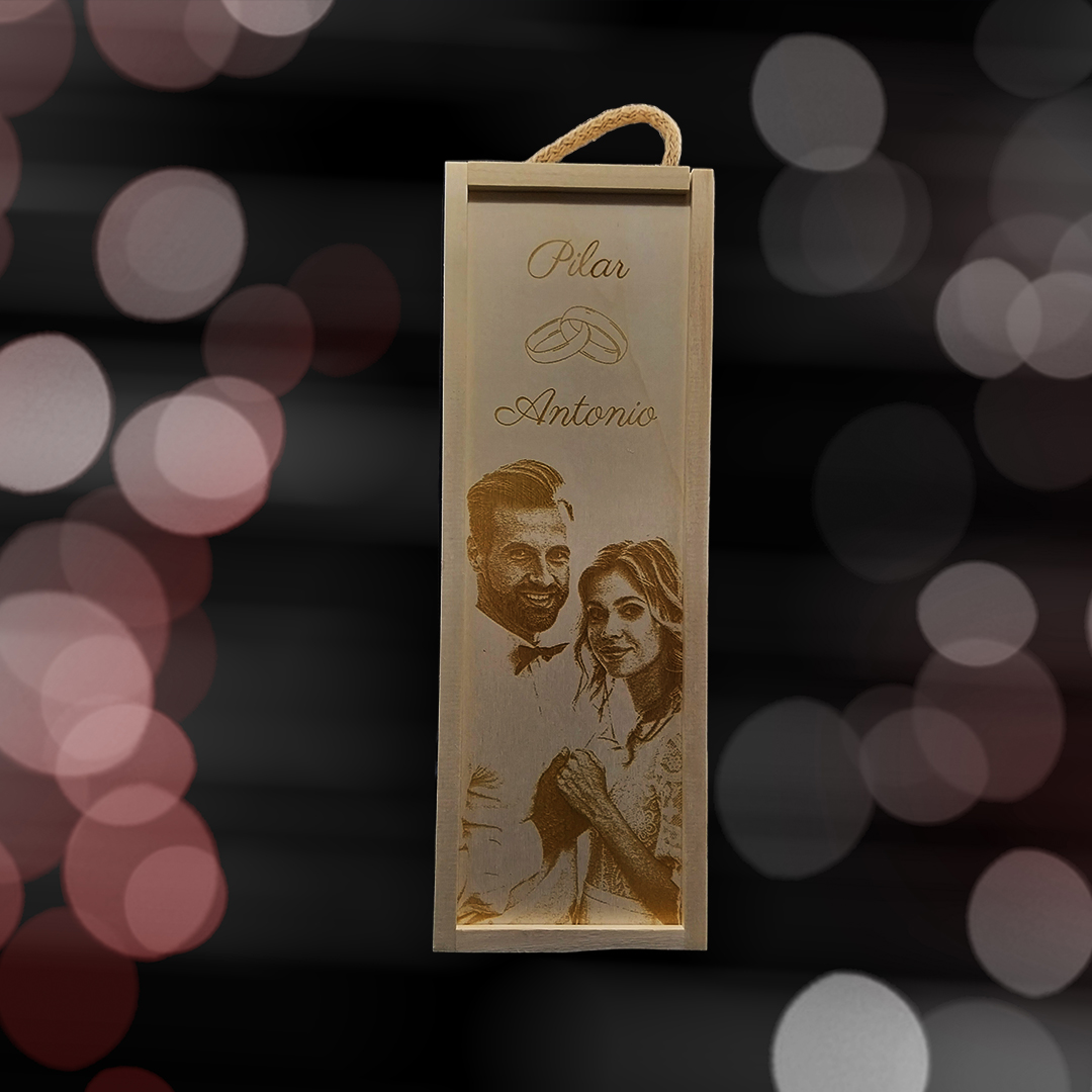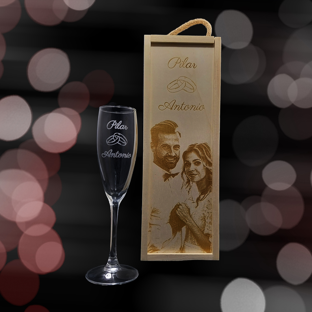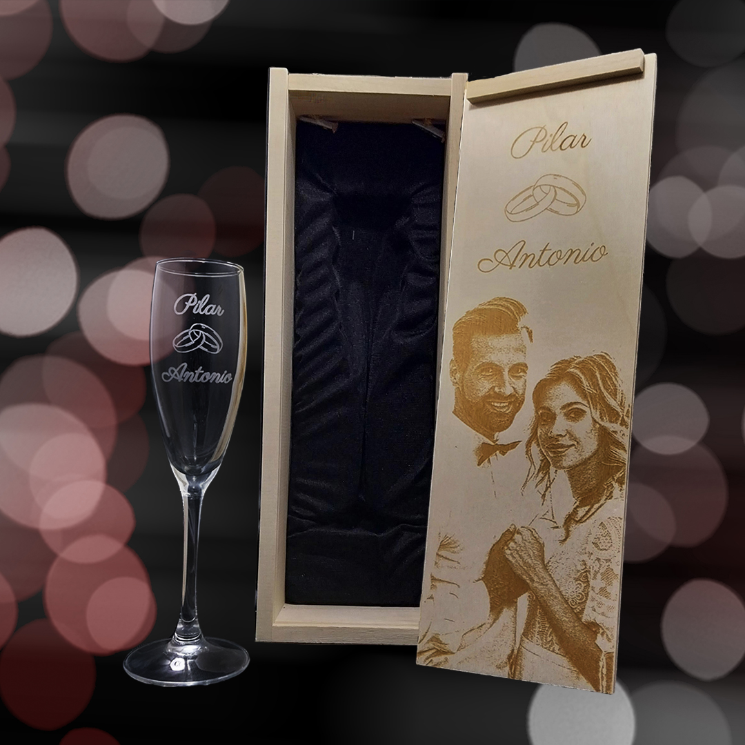 Personaliza tu Kit de 1 copa de cava grabadas con estuche de madera personalizado Modelo para Bodas con Alianzas con fotos y textos, personalizada la copa y la caja de madera, con mensajes, dedicatorias, agradecimientos, y mucho más. Haz un regalo único y original donde marcarás la diferencia.