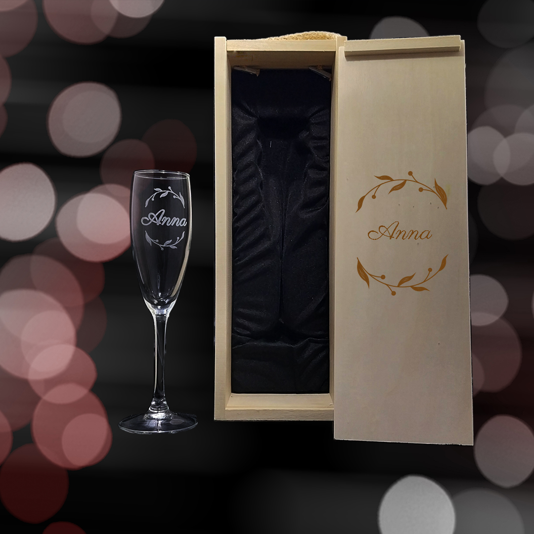Kit de 1 copa de cava grabada a punta de diamante con estuche de madera personalizado Modelo Corona de Hojas.