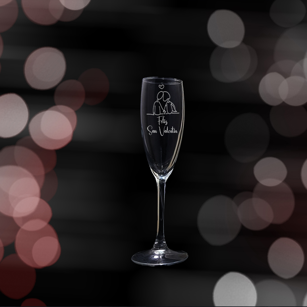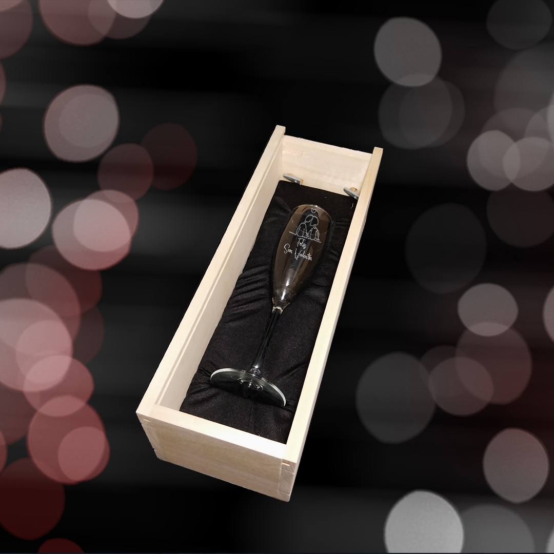 Kit de 1 copa de cava grabada a punta de diamante con estuche de madera personalizado Modelo San Valentín.