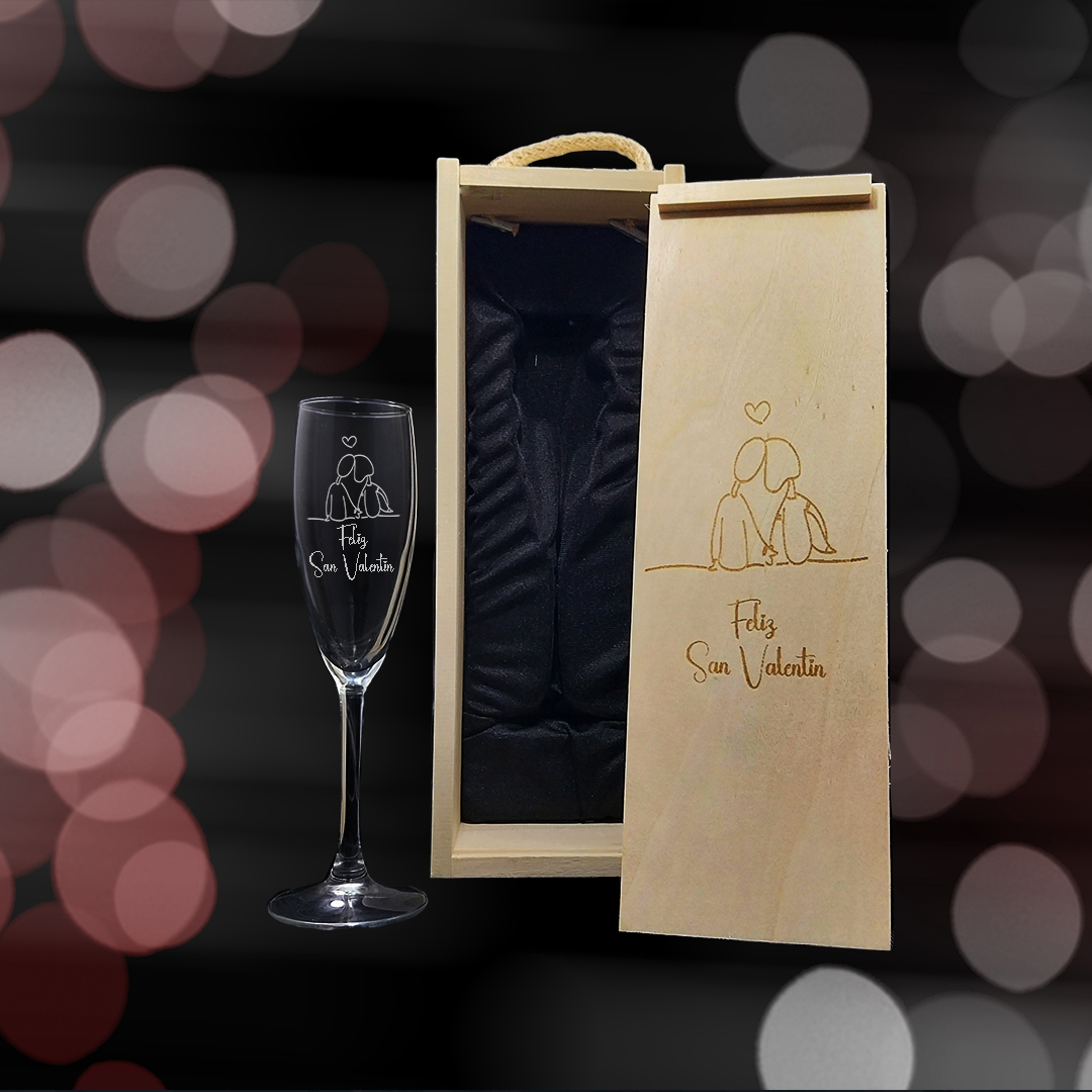 Kit de 1 copa de cava grabada con estuche de madera personalizado Modelo San Valentín.