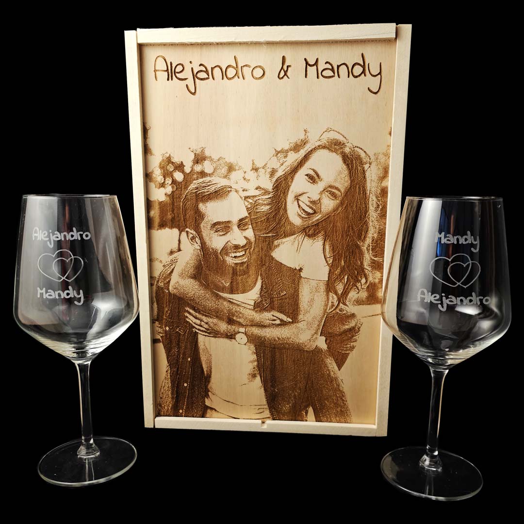 Personaliza tu Kit de 2 copas de vino grabadas con estuche de madera personalizado Modelo para Enamorados con fotos y textos, personalizada las copas y la caja de madera, con mensajes, dedicatorias, agradecimientos, y mucho más. Haz un regalo único y original donde marcarás la diferencia.