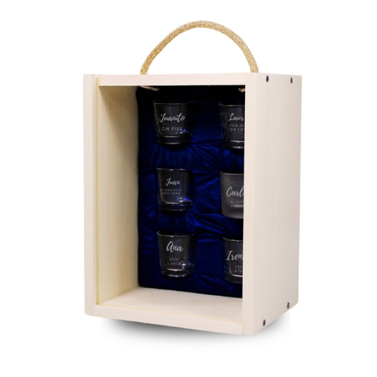 Juega y diviértete creando tu Kit de 6 chupitos personalizados con caja de madera grabada.