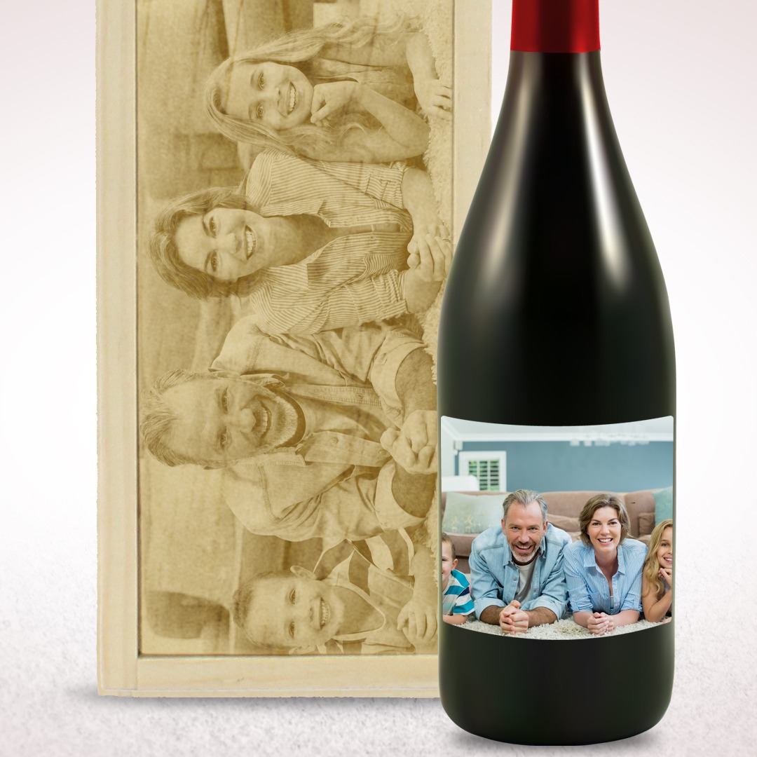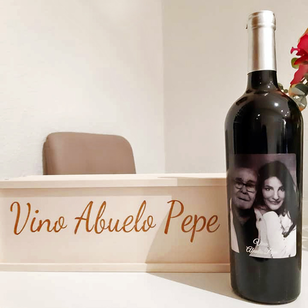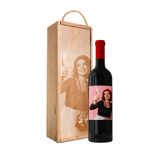 Vino personalizado con caja de madera