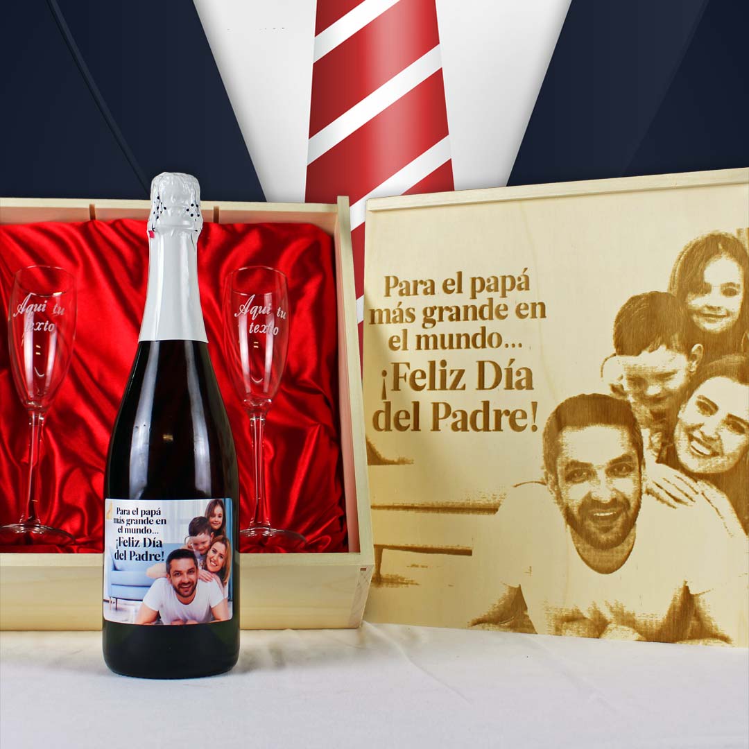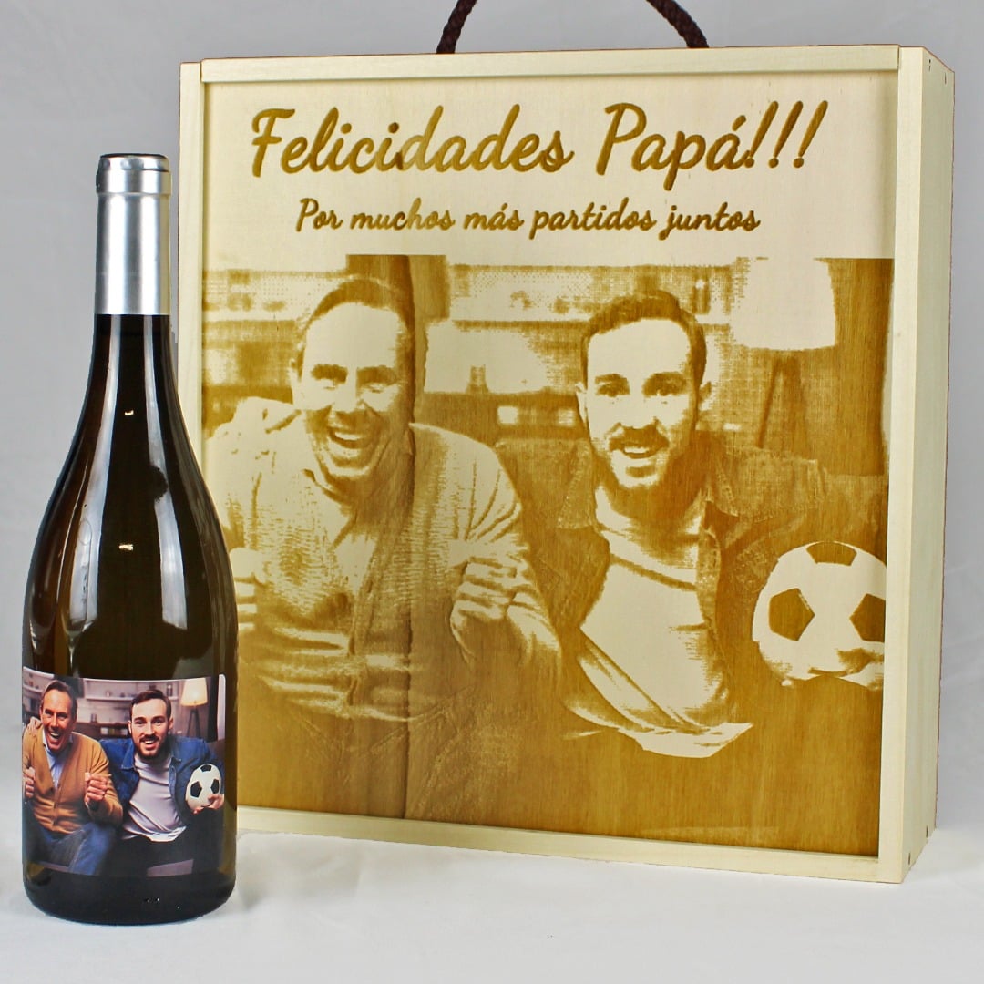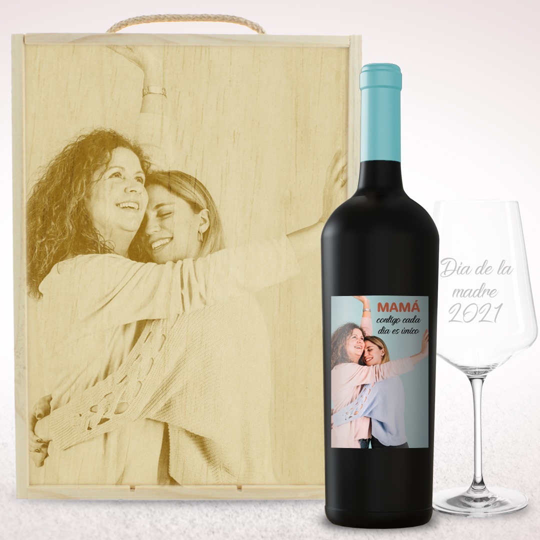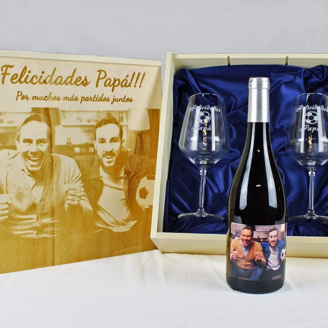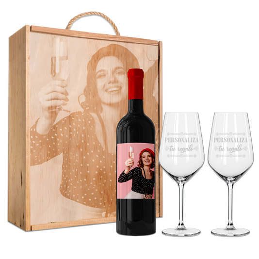 Personaliza tu kit de vino con caja y 2 copas con fotos y textos, personaliza las etiquetas delantera y trasera, personaliza la caja de vino de madera y las copas, con mensajes, dedicatorias, agradecimientos, y mucho más. Haz un regalo personalizado, único y original donde marcarás la diferencia.