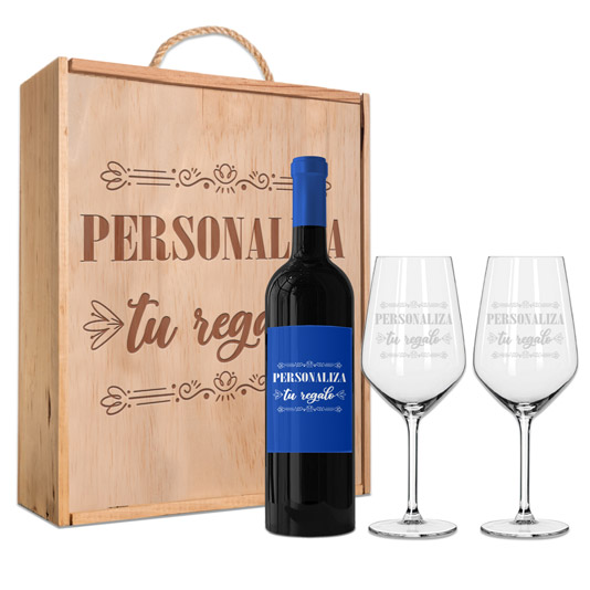 Bienvenid@ a nuestra sección de vino personalizado con caja y dos copas.