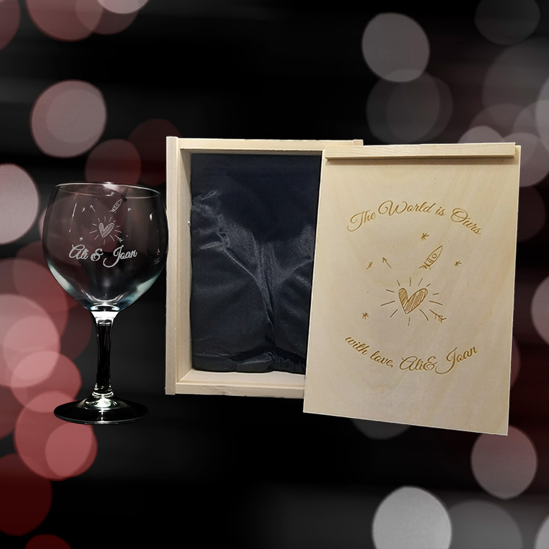 Kit de 1 copa de gintonic grabada a punta de diamante con estuche de madera personalizado Modelo Corazón Estelar.