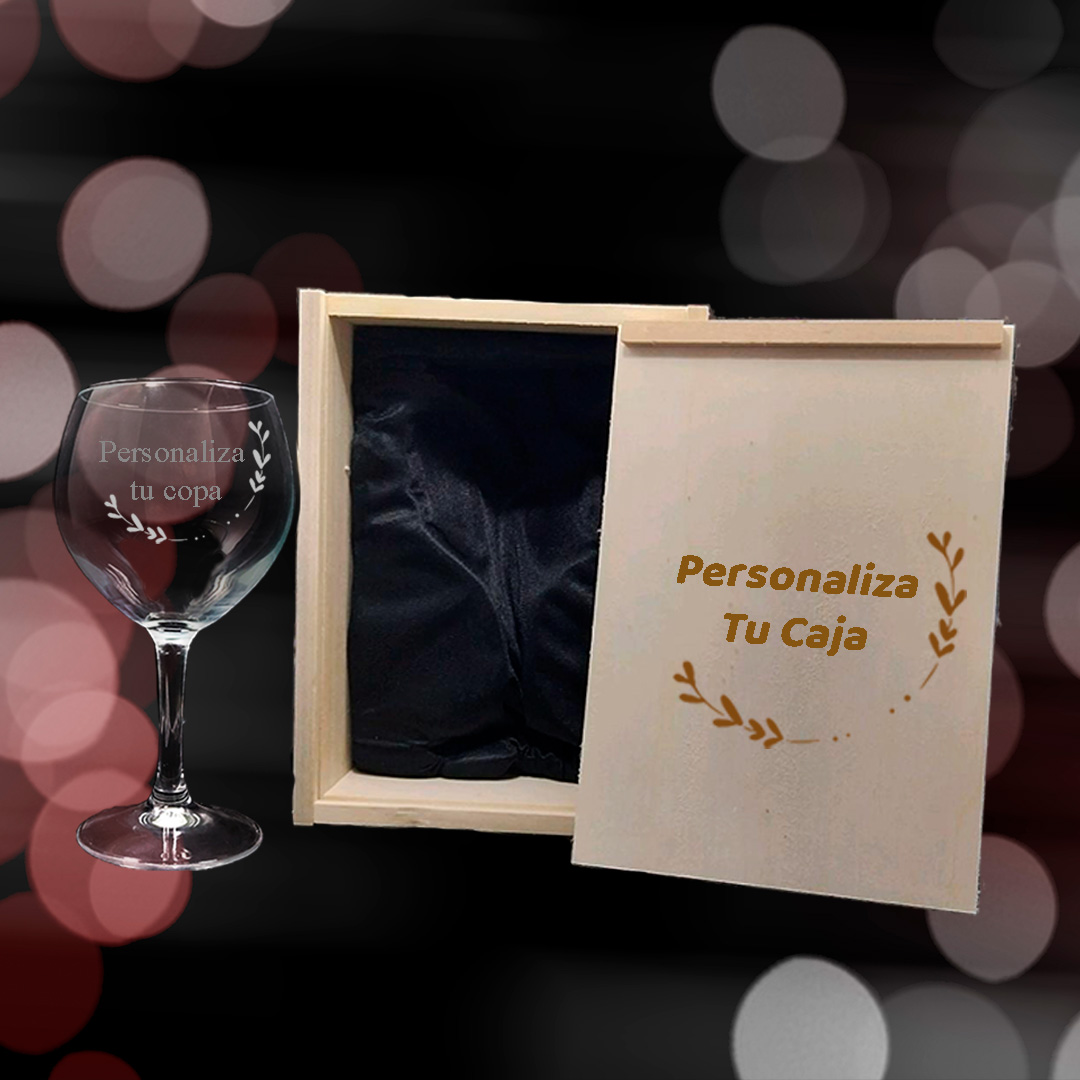Personaliza tu Kit de 1 copa de gintonic grabadas con estuche de madera personalizado Crear mi diseño desde cero con fotos y textos, personalizada la copa y la caja de madera, con mensajes, dedicatorias, agradecimientos, y mucho más. Haz un regalo único y original donde marcarás la diferencia.