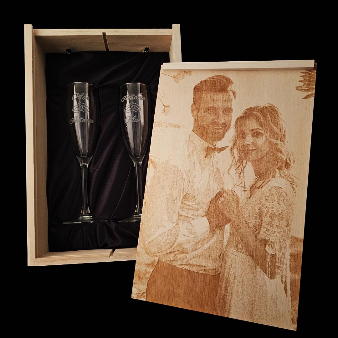 Personaliza tu Kit de 2 copas de cava grabadas con estuche de madera personalizado Modelo para Bodas con Alianzas con fotos y textos, personalizada las copas y la caja de madera, con mensajes, dedicatorias, agradecimientos, y mucho más. Haz un regalo único y original donde marcarás la diferencia.